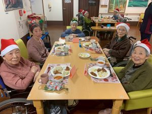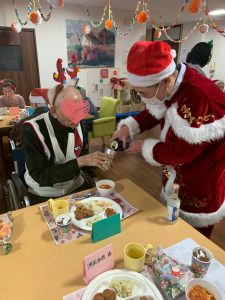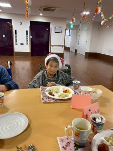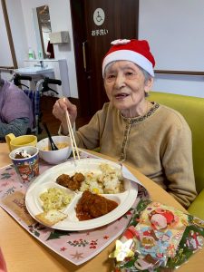 プレゼント配布の後は、豪華なクリスマスプレートが提供されました。いつもと違う楽しい雰囲気の中で、みなさんパーティー気分を味わっているご様子でした。サンタさんからも「いっぱいどうぞ…」