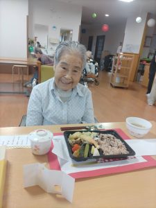 式典への出席は賀寿の方とそのご家族様のみでしたが、入居者様お一人お一人に薔薇のソープフラワーをお渡しさせていただき、お祝い膳のお弁当が提供されました。