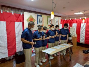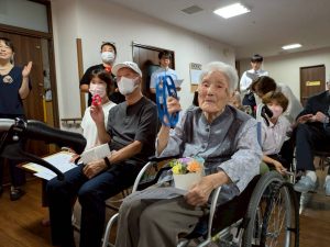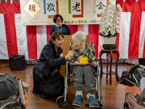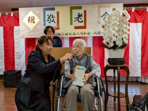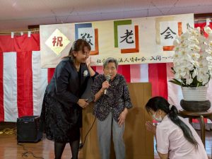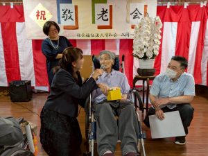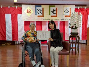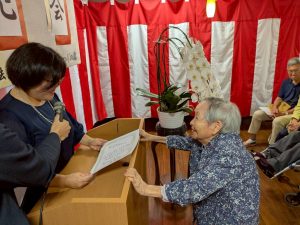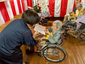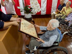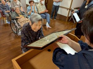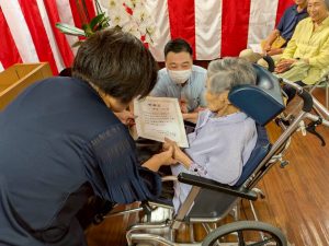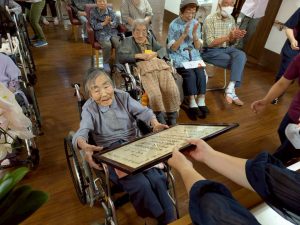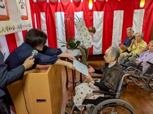 式典では、賀寿の方(米寿3名、白寿1名、百賀3名、珍寿【112歳】1名)に感謝状や記念品をお渡しし、お一人ずつお言葉をいただきました。 悲観的な言葉は一つもなく、謙虚で感謝と思いやりにあふれたコメントばかりで、ご家族や職員も思わず涙ぐんでしまう場面もありました。