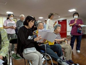 実習にきていた入間准看護学校の学生さんが「上を向いて歩こう」「明日がある」の2曲をハンドベルで演奏してくれました。アンコールではみんなで歌いながらタンバリンやマラカスを鳴らしてとても楽しいひと時となりました。学生のみなさん、ありがとうございました!