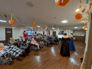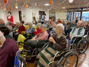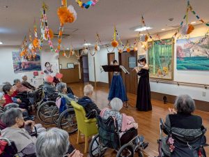 できるだけ多くの利用者様・入居者に聴いていただけるように、とデイサービス、2階ホール、3階ホールと3箇所で開催してくださいました。