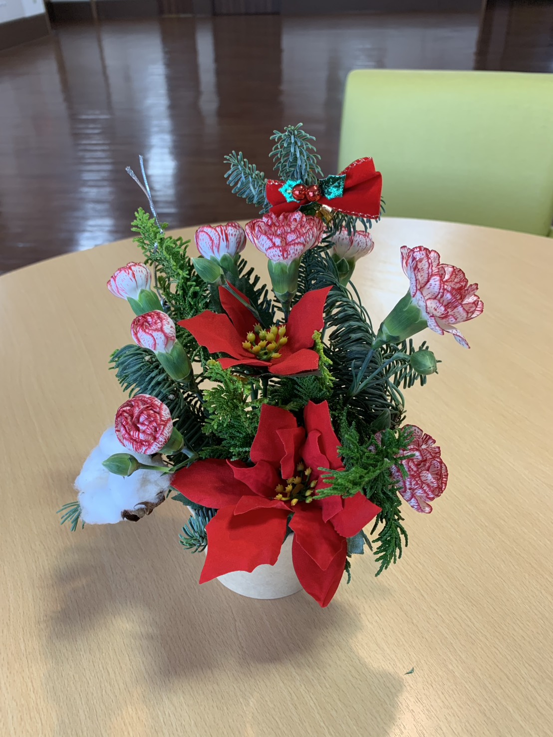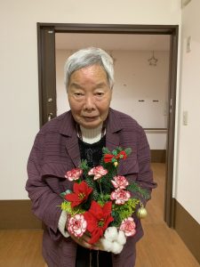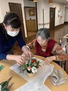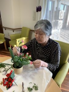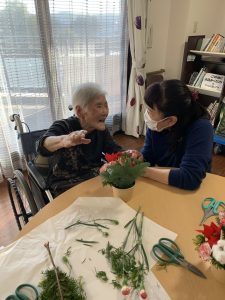 入間つつじの園トピックス 2025年12月6日 11月フラワーアレンジメント 毎月2回、ボランティアの先生が来てくださっているフラワーアレンジメント。毎月季節の生のお花をアレンジするので、皆様楽しみにされています。今月はポインセチアの赤が目をひくクリスマスカラーの作品でした!「きれいね」「冬のカーネーションも素敵ね」と会話しながら楽しく作業していきます。 手が動かせない方でも、その場の雰囲気やお花の香りを楽しみながら、出来上がった作品をお部屋に飾って楽しむことができます。 素敵な作品ができあがり、皆様の笑顔も花咲きました(*^-^*)🌸 前の記事 記事一覧 ホーム 理事長挨拶 法人概要・理念 施設案内 リクルート情報