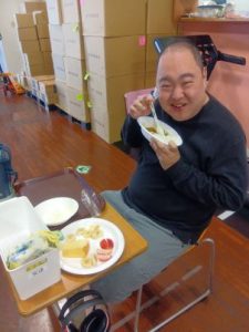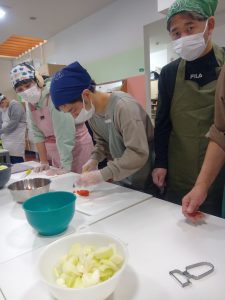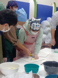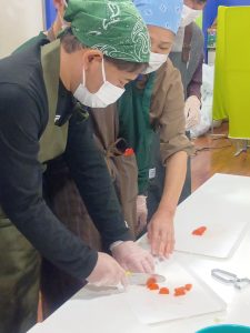 職員が手を添えたり、声掛けなどサポートしながら食材を切りました!