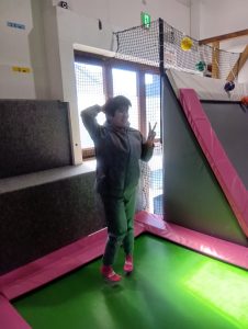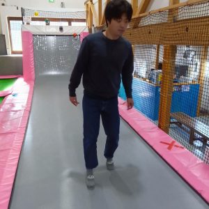 座って飛んだり、走り込んでボールにタッチしにチャレンジして